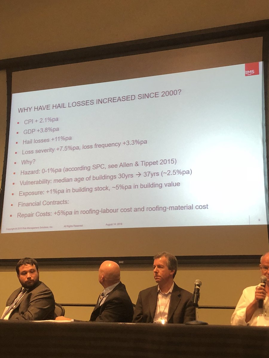 Now onto the fun stuff. How is all the hail research applied to understanding the risk in terms of 💰. Talking about how the cat models use the science and calculate the insurance loss. #hail2018 pic.twitter.com/ie4UJYSTX1