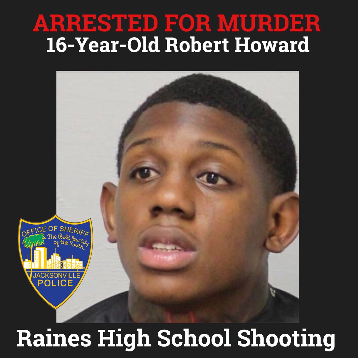 16-Year-Old Robert Howard has been arrested for Murder and two counts of Attempted Murder for the triple shooting at Raines High School that left one dead. @DuvalSchools pic.twitter.com/e3VtMFxYsw